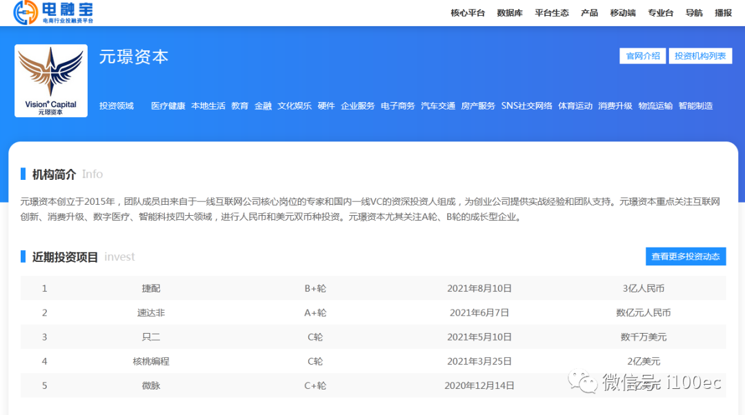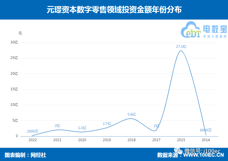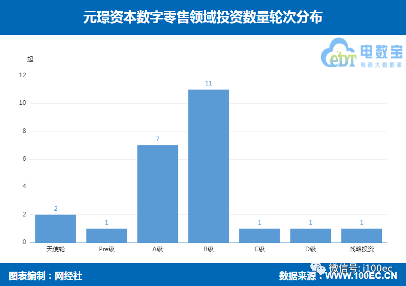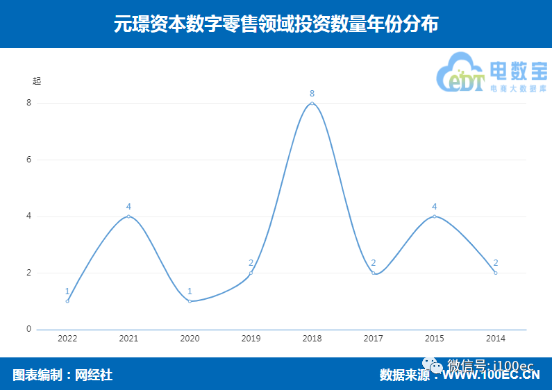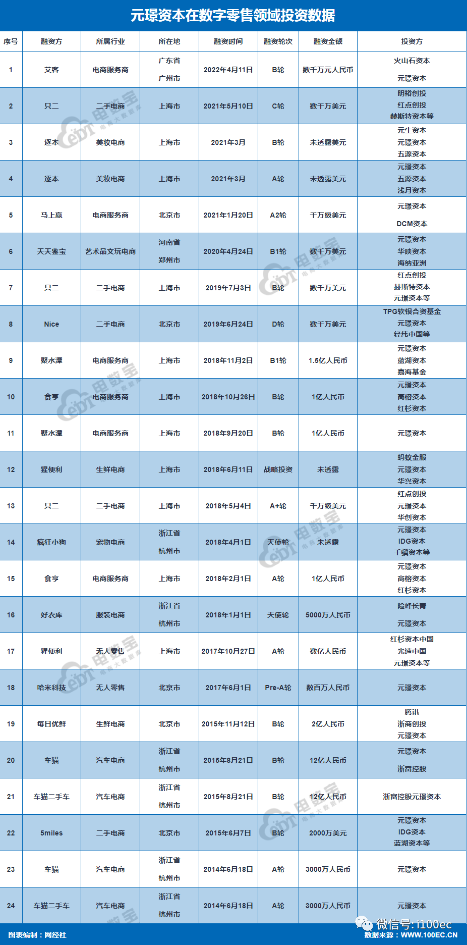 据网经社旗下电商大数据库“电数宝”(DATA.100EC.CN)监测数据显示,2007年10月至2022年4月,元璟资本累计参与了24起数字零售的投资,涉及公司分别为:艾客、只二、逐本、马上赢、天天鉴宝、Nice、聚水潭、食亨、猩便利、疯狂小狗、好衣库、哈米科技、每日优鲜、车猫、车猫二手车、5miles等。(详见网经社专题:http://www.100ec.cn/zt/yjzbszls/)