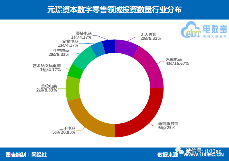 数字零售赛道上,元璟资本最青睐电商服务商,投资数量为6起;二手电商为5起;汽车电商投资数量为4起;生鲜电商、无人零售和美妆电商各2起投资;服装电商、宠物电商和艺术品文玩电商各1起投资。