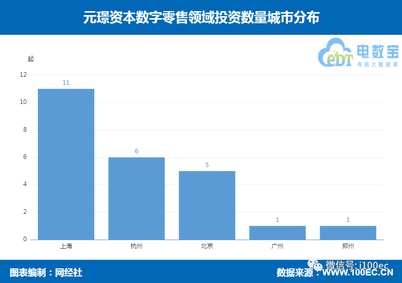 城市分布上,元璟资本在上海投资次数最多,各为11起;杭州为6起;北京为5起;广州和郑州各1起。