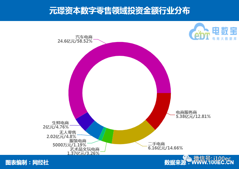 投资金额中,元璟资本偏爱汽车电商行业,金额为24.6亿元;其次为电商服务商,为5.38亿元;二手电商为6.16亿元;电商服务商为5.38亿元;无人零售为2.02亿元;生鲜电商为2亿元;艺术品文玩电商电商为1.37亿元;服装电商为5000万元。