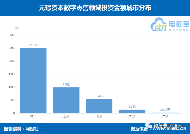 融资金额城市分布上看,在杭州投资了25.1亿元;在上海投资了9.9亿元;在北京投资了5.4亿元;在郑州投资了1.3亿元;在广州投资了2000万元。