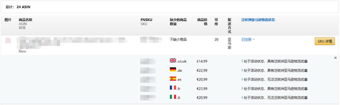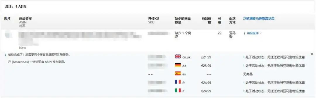 所谓“缺失的商品”,是指商品在规定的欧洲站点中缺少一个或多个在售商品信息。为了确保您能自动注册并享受亚马逊物流欧洲整合服务的优惠,您必须在规定的每个亚马逊欧洲站点中激活亚马逊物流商品。