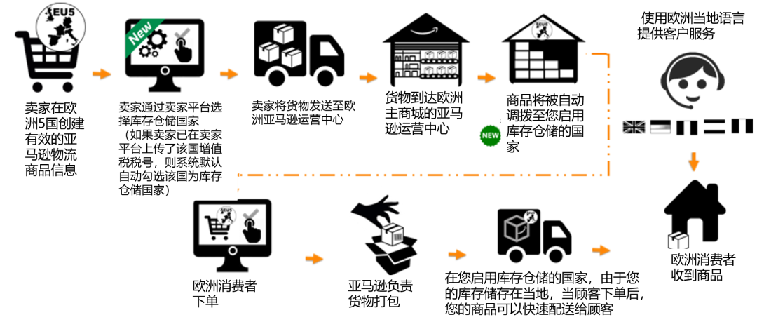 亚马逊物流欧洲整合服务(Pan-EU)是亚马逊物流(FBA)在欧洲的跨地区解决方案之一,您在欧洲相应站点发布FBA商品后,选择您存放库存的国家或地区,之后您只需将商品运送到一个欧洲当地的亚马逊运营中心,亚马逊将根据预期的消费者需求,在您选择存放库存的国家或地区,调配和储存您的商品,这一过程无需支付额外费用。在您的商品卖出后,亚马逊将对您的订单进行分拣、打包,并将商品配送到当地或境外。
