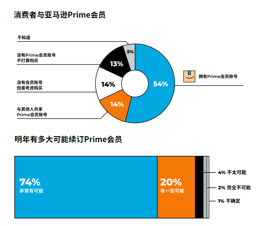 消费者对Prime会员有非常高的忠诚度,受访者中,拥有Prime会员账号的比例从上个季度的41%增长到54%,愿意续费的比例从68%增长到74%。
