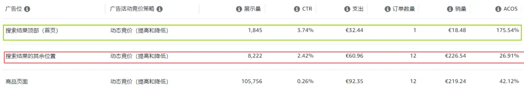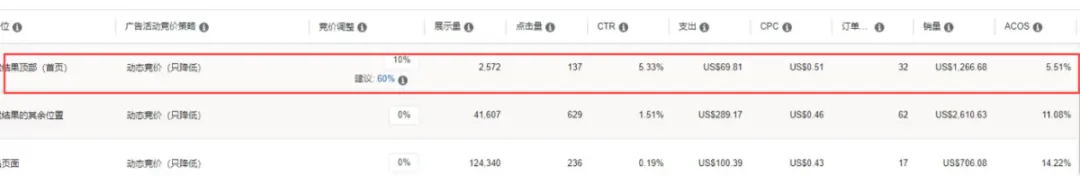 “搜索结果顶部(首页)”的ACOS低到惊人的 5.51%!转化率和点击率都超高。