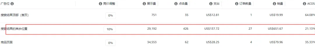 看这组数据:点击量比较均衡,但订单量重点分布在“顶部”,“其他位置”和“商品页面”的点击可以,ACOS也较高。