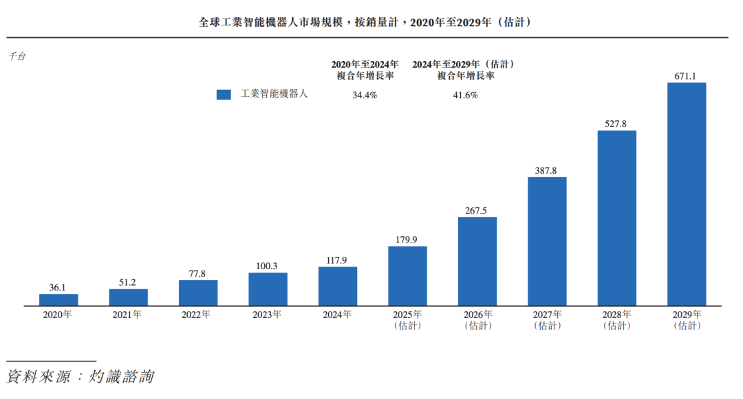 据招股书,全球智能机器人市场规模在2024年超过人民币2778亿元,预计到2029年将达到人民币7085亿元,2024年至2029年的复合年增长率为20.6%。其中,工业智能机器人将是仙工智能的重要应用场景之一,其市场规模预计将从2024年的220亿元人民币,以高达39.2%的复合年增长率,增至2029年的1150亿元。
