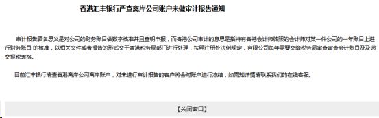 目前汇丰银行正清查香港离岸公司离岸账户,对未进行审计报告的客户将会对账户进行冻结。