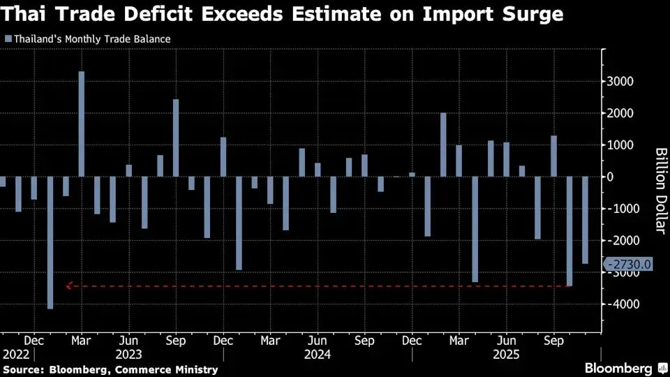 泰国连续第二个月出现高于预期的贸易逆差,进口激增远超疲软的出口增长,凸显了包括泰铢走强威胁竞争力在内的经济风险。