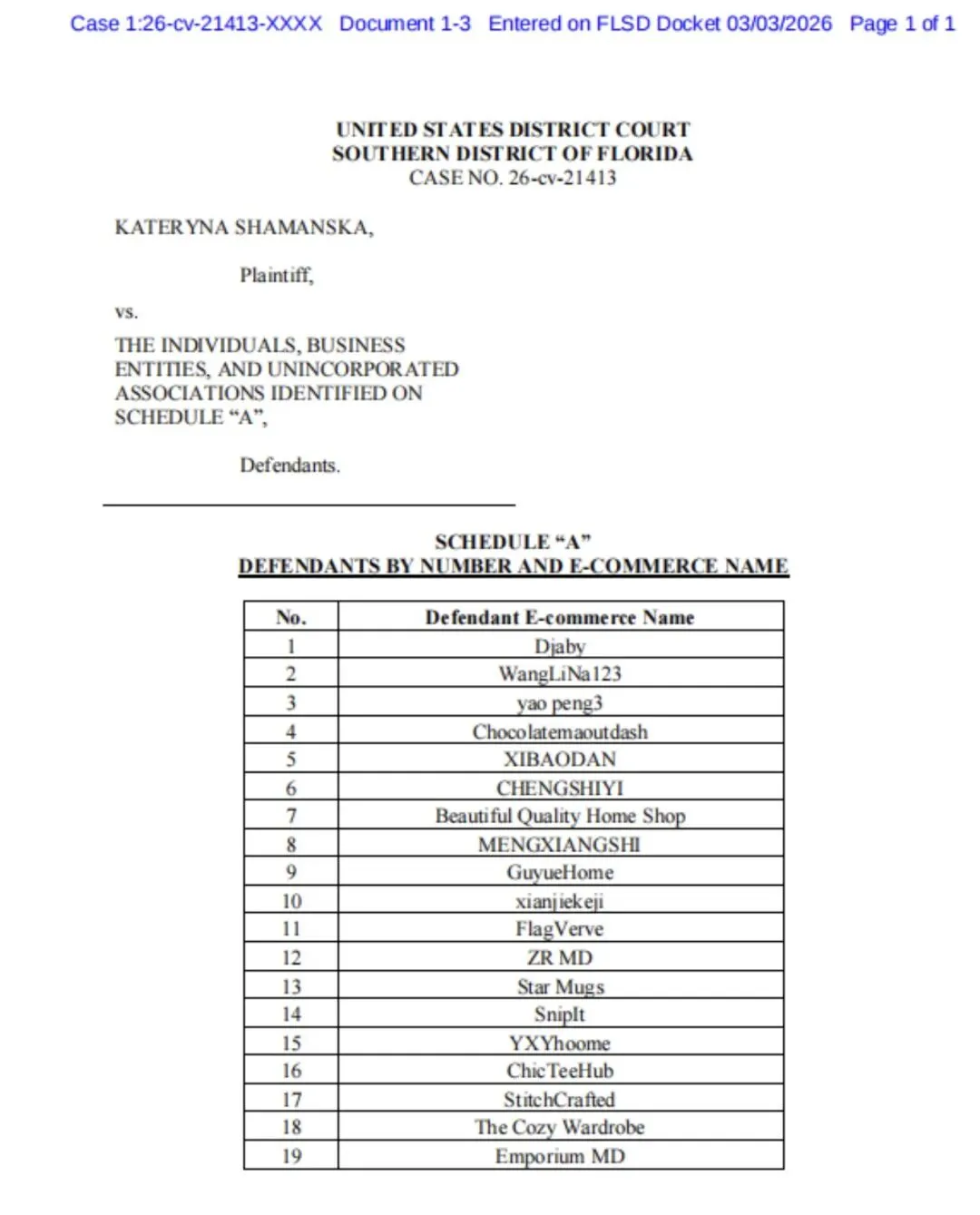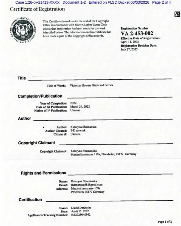 【26-cv-21413】维多利亚花鸟图维权!跨境卖家速看避雷!