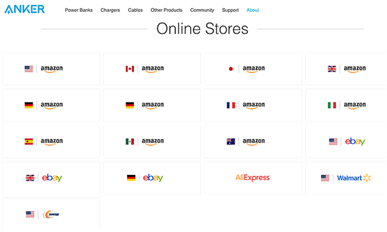 Anker不仅有亚马逊美国站,几乎亚马逊对中国开通的所有站点都覆盖了。此外还有eBay、速卖通和新蛋的店铺,以及独立站。