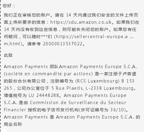 邮件上说,如果卖家在14天内没有通过链接完善自己的信息,将会被关闭账户。然而咨询了在线客服后,却被告知这并不是官方发的,最近已经收到很多投诉,目前正在调查这个事件。