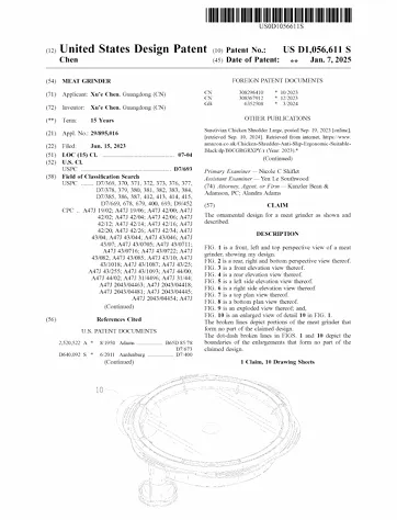 美国外观设计专利 US D967340 S(2022年10月18日授权)