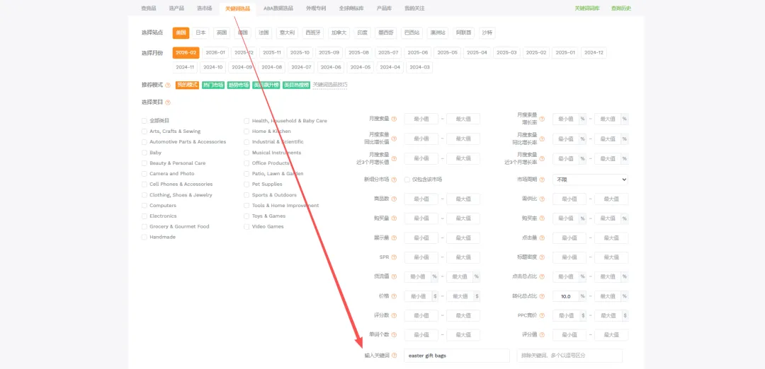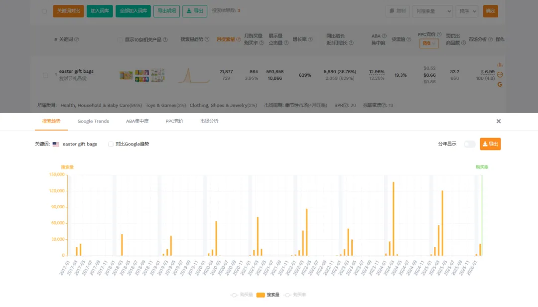 像"easter gift bags"这类节日礼品词,搜索量天然有季节性,旺季爆量、淡季接近零。如果要做这类词,时间节点的判断比总量更重要——你的货能不能在流量爆发前到货架上,这个问题比货流值本身更关键。