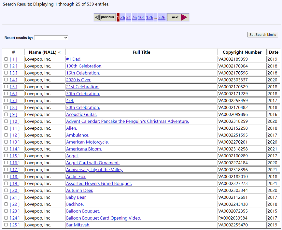上面的立体卡片人偶外观专利和天际线弹出式卡片外观专利申请人是 LovePop, Inc.,小Jude检索了一下该公司,共登记了526个版权。