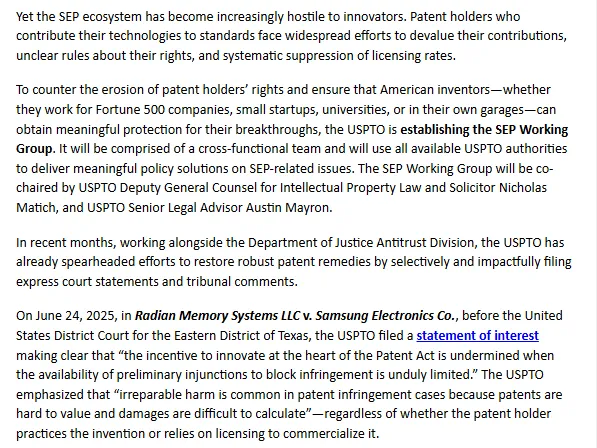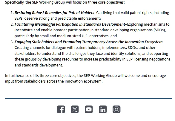 新成立的标准必要专利工作组将致力于确保所有专利权人 —— 无论其规模大小或专业程度高低 —— 均能获得公平对待,且在标准纳入专利技术的任何场景下,其权利均能得到强有力且可预期的执行。本次宣布是美国专利商标局近期在专利救济与执法领域相关工作的延伸与深化。