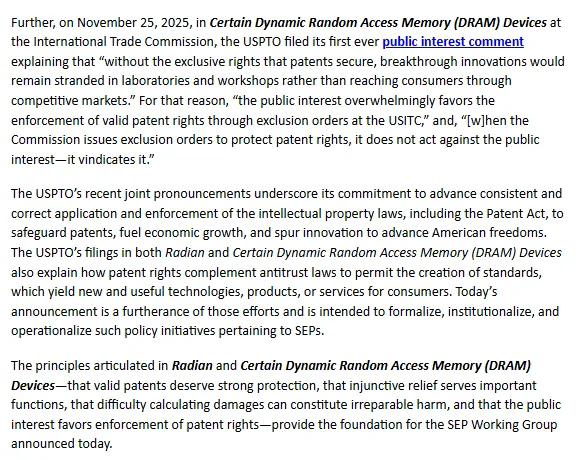 25年12月29日,美国专利商标局发布通知(NPRM):美国专利商标局宣布成立标准必要专利工作组 重振美国在技术标准领域的领导地位。