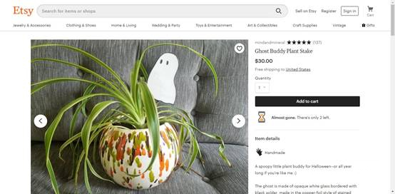 同样这款白色玻璃制成的幽灵园艺支架也大受欢迎。根据Etsy的万圣节趋势报告,与去年同期相比,过去三个月中以幽灵为主题的花架的搜索量增长了137%。