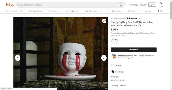 同样主打恐怖路线的婴儿蜡烛也是如此。当红色蜡烛融化时,蜡会从这个形状像婴儿头颅的白色陶瓷烛台的两个眼孔中流出。Etsy表示这类恐怖风格的蜡烛较受买家欢迎,且这款产品更是当中翘楚。