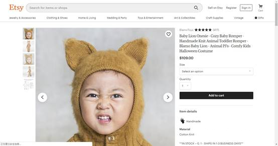 Etsy用户在过去的三个月中搜索狮子服饰的比例飙升了14%,而这款狮子连体衣既满足了节日装扮需求,同时也保暖舒适,十分实用。
