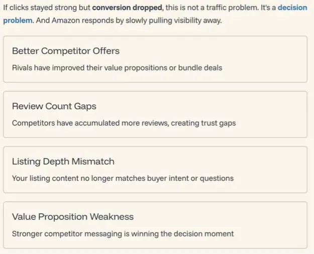 很多人第一反应就是慌:是不是我的产品质量出问题了?还是Listing被亚马逊惩罚了?然后着急忙慌地开始调广告、调价格,做促销等等一顿操作。