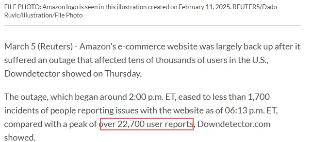 故障于美东时间3月5日下午2点左右爆发,监测平台Downdetector数据显示,短时间内收到超过2.27万起用户故障报告,峰值时超过22,700起。