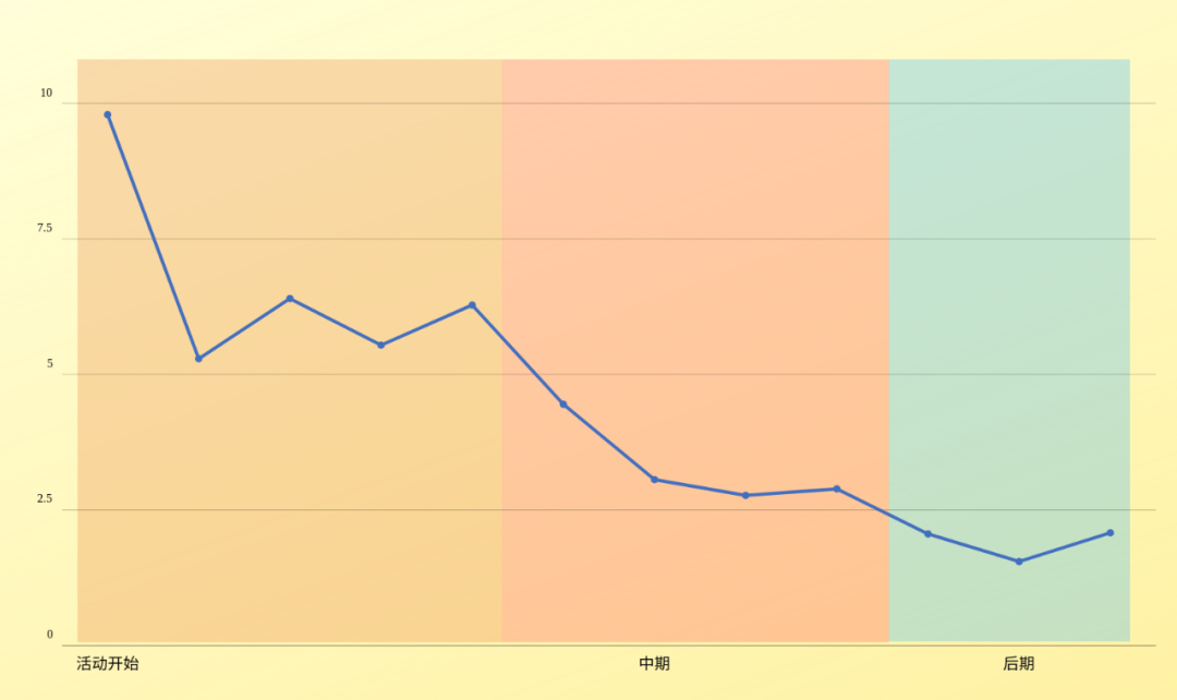 刚开始的40天左右的高投入时期:平均日花费大于5美元,尤其是刚开始的10天,平均日花费达到了10美元;