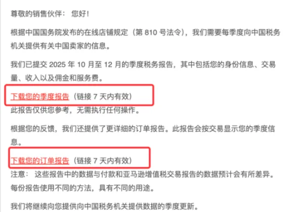 3月27日,亚马逊向卖家推送了2025年Q4(10月至12月)的税务数据报告,包含两个下载链接:季度汇总报告和订单级别明细报告。