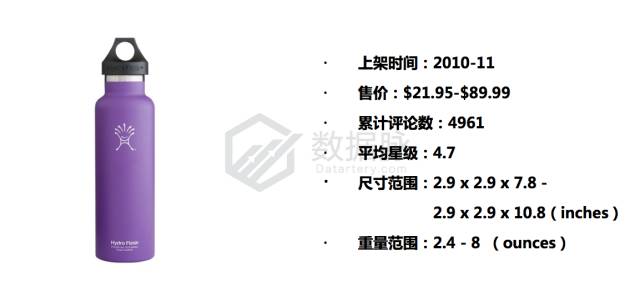 Hydro Flask 是美国知名水壶生产商,在户外保温壶方面品牌美誉度极高。在本期的美亚爆款痛点分析报告中,分析师菜包包就通过分析买家评论来带大家重点解读一下大品牌保温壶的优势和不足。我们选取的这款中空绝缘不锈钢水壶采用的是旋转瓶盖(standard loop cap),于2010年11月上架,容量从12到24盎司,售价在$21.95-$89.99之间,累计评论为3881条,平均评论星级达到4.7。