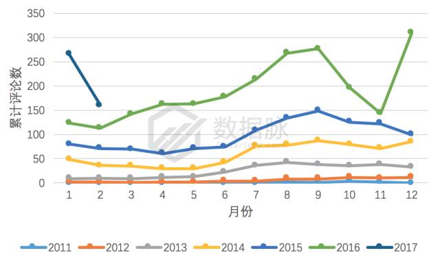 对比不同年份月度累计评论量可以发现,评论量逐年增加,2015年增量最多,并且每年从6月开始,销量显著上升,在9月达到高峰。