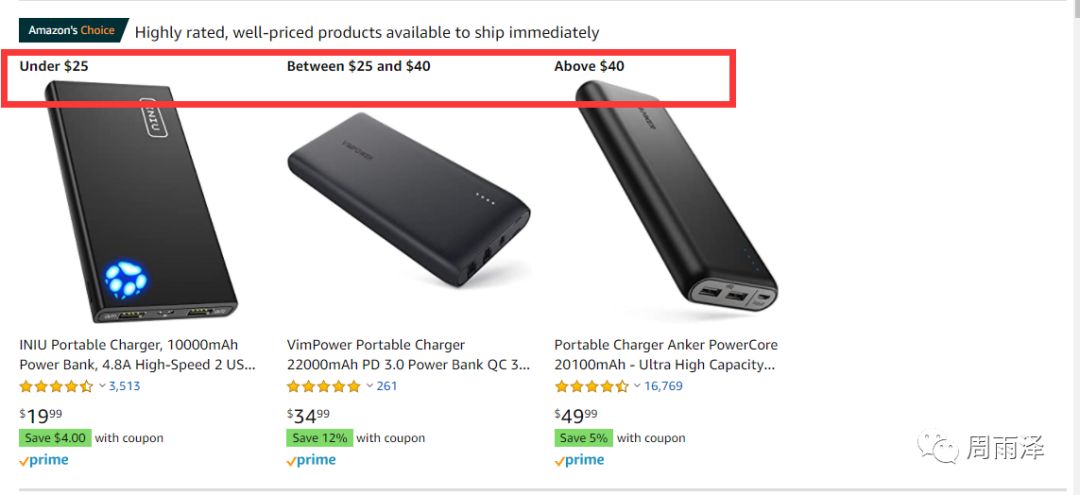 第一个出现了单独的AMAZON CHOICE,一个关键词下面多个产品获得特殊标签,主要是按照价格分布来展示,我们也可以操控这一板块,认为的干预,让自己获得这一区域的流量入口。