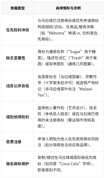 异议需基于《马拉维商标法》第21条法定事由,核心依据包括: