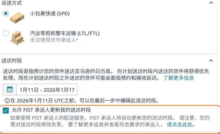 基于卖家体验及服务商数量考虑,我们将不再在卖家平台创建货件步骤中以下拉清单形式展示FIST承运商名单,下拉选项中统一仅展示“FIST 承运人”(英文界面下为“FIST Carriers)供卖家勾选。
