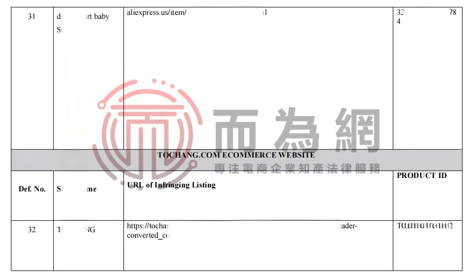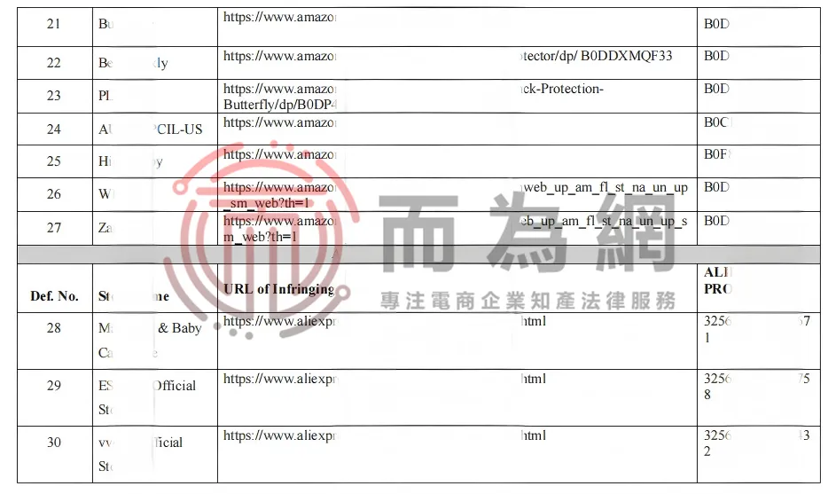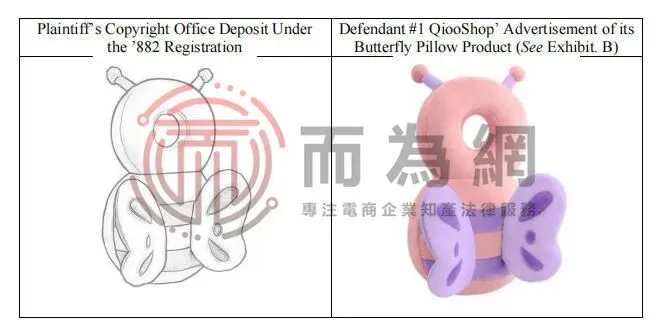 原告Qingtao Yu是一位国人卖家,名下有一项名为《Butterfly anti-drop pillow》的婴儿头部保护背包版权。本案涉及的侵权产品正是该版权,共32家店铺中招。