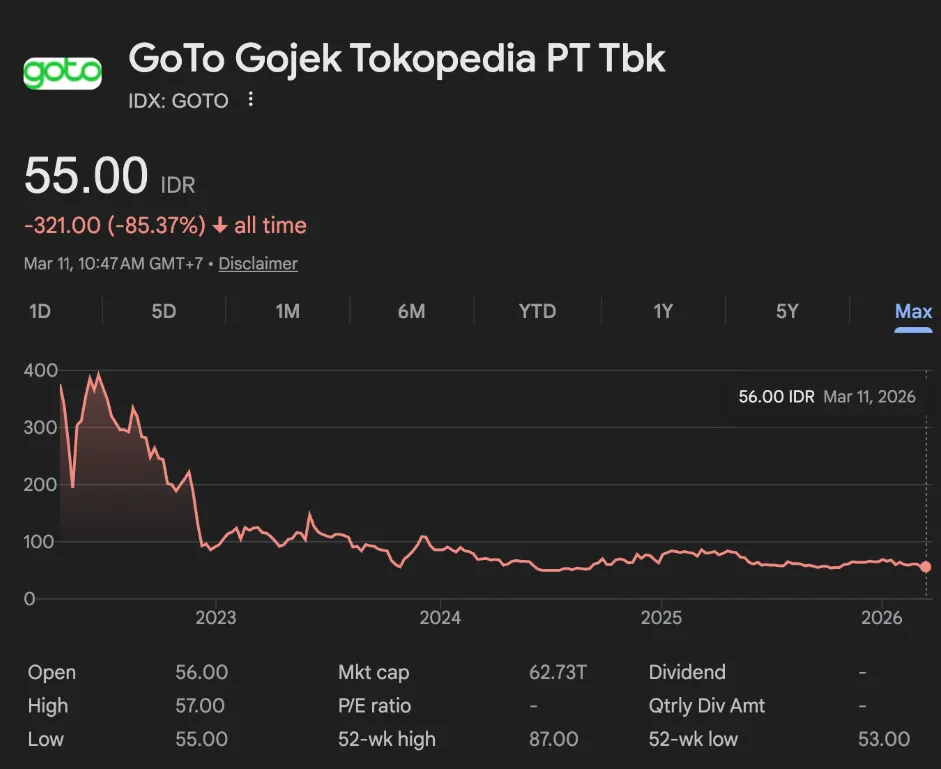 不过GoTo现在面临着一些质疑:创始人被捕深陷一场动机可疑的贪腐案;而且在过去两年给公司带来了很多纪律性的前CEO Patrick Walujo在去年底也传因为和股东相关的一些战略决策而辞职。虽然整体公司在盈利性上有诸多改善、金融业务也在印尼各家互联网公司里面做得相对比较好,但是股价的长期低迷也让众多大股东感到很无奈: