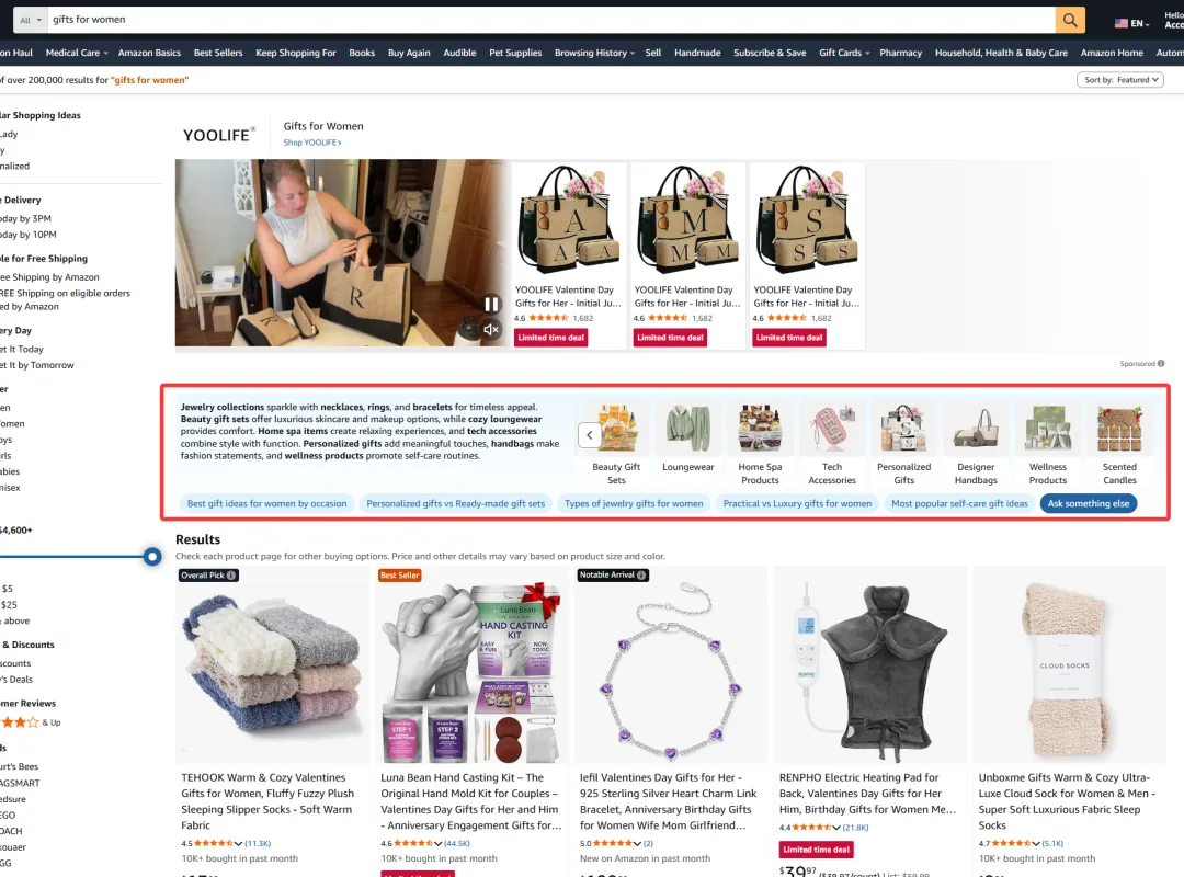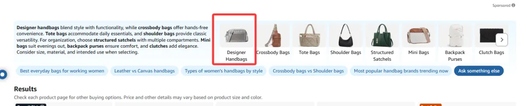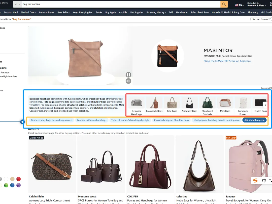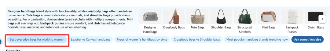 过去,像 bag for women 这样的词,像是一个巨大的流量池,用户自己在里面翻、试、比较,卖家靠关键词覆盖和广告争取被点到的机会;而现在,Rufus 会在用户真正往下浏览之前,就先把这部分流量拆开,引导到更明确的需求路径里。