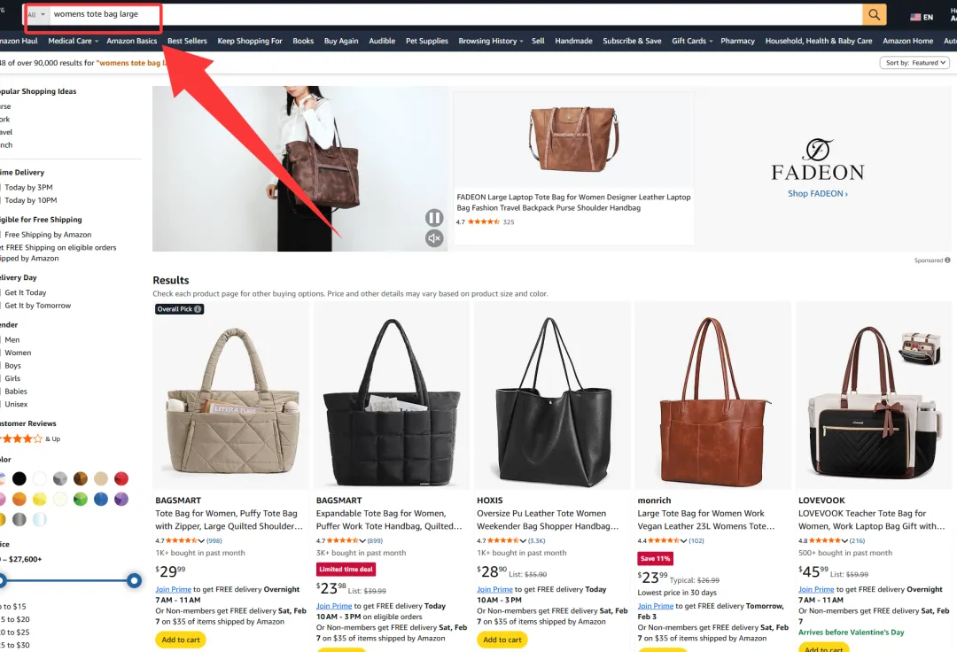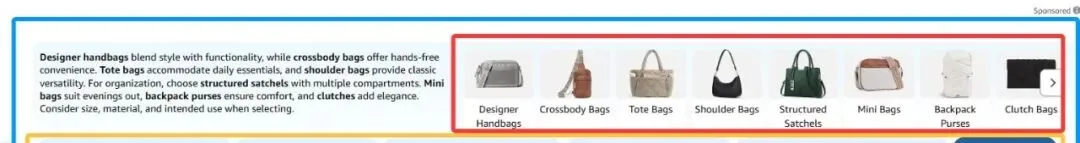 如果你的产品在其中某一个细分关键词下(比如 womens tote bag large)匹配度很高,你就有机会通过这个头条导购入口,在第二步出现在买家面前,哪怕你在大词bag for women的自然排名里可能得翻两三页。