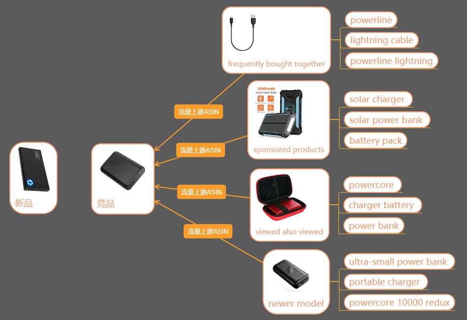 比如:我们的新品是充电宝,那么我们看看我们的竞品anker的充电宝,看看它的“Newer model” “frequently bought together” “Sponsored product”分别都有哪些ASIN,收集起来,然后通过关键词反查工具找到他们的高频关键词,然后拿这些词批量打广告。