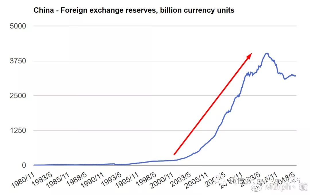 如图为中国的外汇储备余额,从2001年中国加入WTO之后一飞冲天。