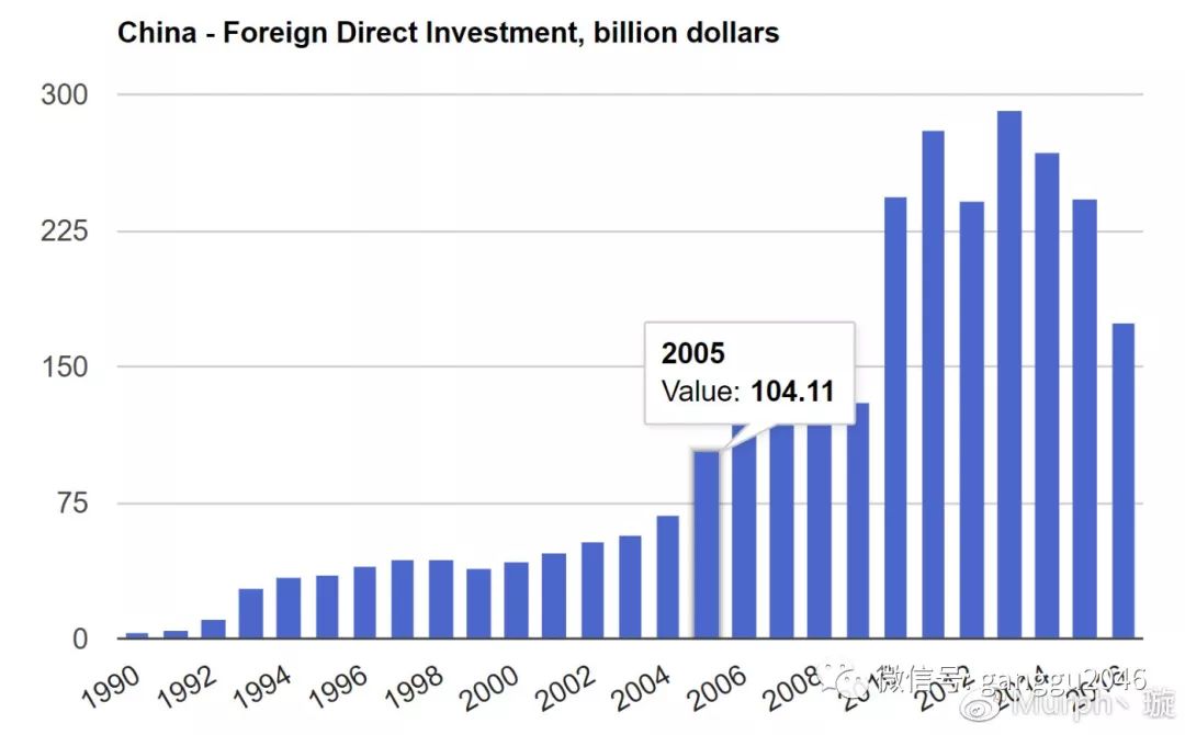 当一个国家的经济经历繁荣时,它往往会吸引全世界的投资者。如下图为中国的外商直接投资,从2001年开始,每年都超过500亿美元,2005年中国宣布将允许人民币升值之后,更是每年都超过1000亿美元。