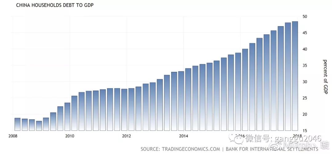 如图为中国居民负债与GDP的比,在过去十年中伴随房产泡沫快速上涨。