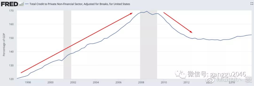 结果就是,虽然美国在2001年还是遭遇了经济衰退(灰色部分 —— 连续两个季度GDP负增长),但是债务并没有下降,而是继续高歌猛进。