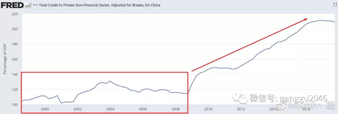 如图为中国私人债务占GDP的比。我们可以看到在中国经济发展最繁荣的阶段,即2001至2008这几年,虽然债务本身也在飞速的增长,但由于经济(收入)的增速也很快,所以债务与GDP的比几乎没有什么变化。按照Ray的标准,我们可以说那些年所增加的债务都是好债务,它们被投资在了可以产生经济效益的地方。