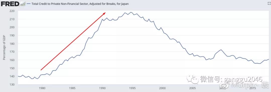 而2008年以后的十年就不同了。对比美国我们发现,在同一时间,美国的这一数据从170%下降到了150%,而中国则从120%上涨到了210%,无论从上涨的速度,还是到达的高度上来看,都几乎是前无古人的。除了一个国家,就是1990年的日本。