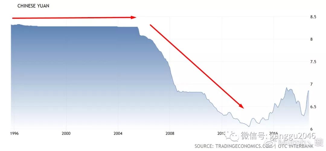 如图为人民币兑美元的汇率,我们发现人民币从1995年到2005年这十年间都被政府强行稳定在8.3这个位置上。但是就像我在贸易战那几篇文章中写到的那样,国际贸易体系毕竟不是只有我们一个玩家,如果我们总想赢,那么别人就不玩了。所以我们不得不在2005年开始允许人民币升值。而人民币升值就会导致出口产品变贵,竞争力下降,而进口产品变的便宜,国内厂商竞争压力陡升。
