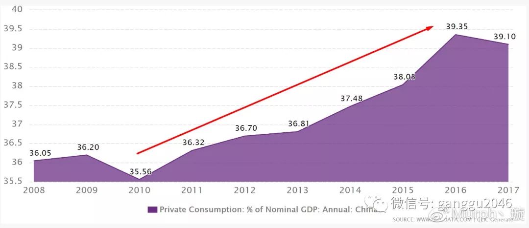 如图为中国私人消费占GDP的比,从2010年开始快速上升。由于消费就是收入减储蓄,因此储蓄率也在下滑。
