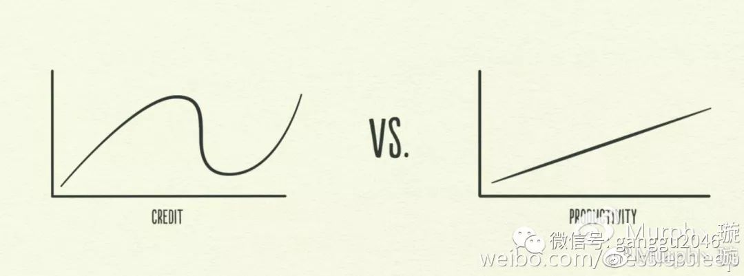 如果没有债务的话,经济的发展(收入的增长)就应该是非常平稳的,像右边那样,收入随着生产力的提高而稳定增长。但是很明显,在真实的世界中一个国家的经济发展往往是左边那种情况,有繁荣,有衰退,形成循环。为什么呢?因为债务可以在短期内提高人们的收入。