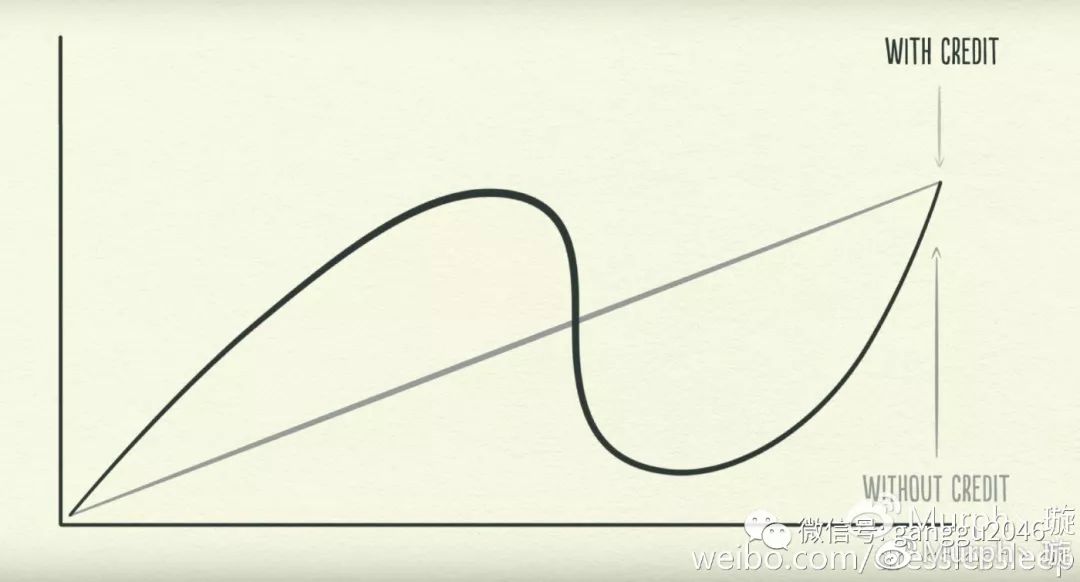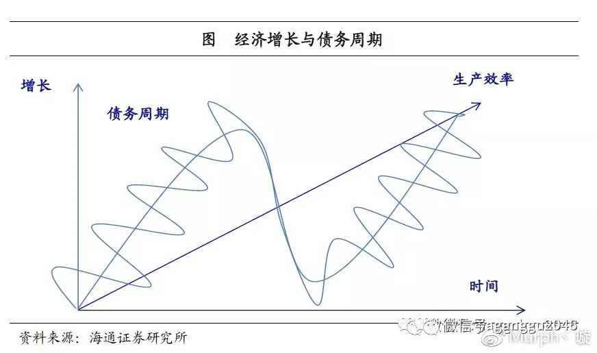 如图,灰色线代表在没有债务的情况下,经济发展(收入增长)的轨迹,黑色线则代表在有债务的情况下,经济发展(收入增长)的轨迹。所以产生了我们耳熟能详的“经济周期”。