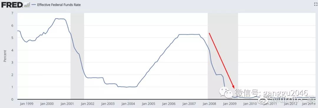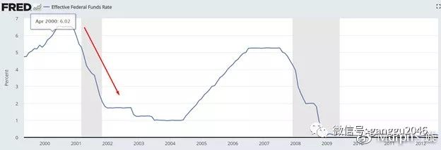 在2001年,美国遭遇了互联网泡沫的崩溃(纳斯达克指数狂跌78%)以及9-11,一场危机近在眼前。为了应对危机,时任美联储主席的艾伦·格林斯潘开始下调利率(印钞)。