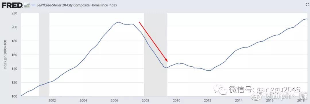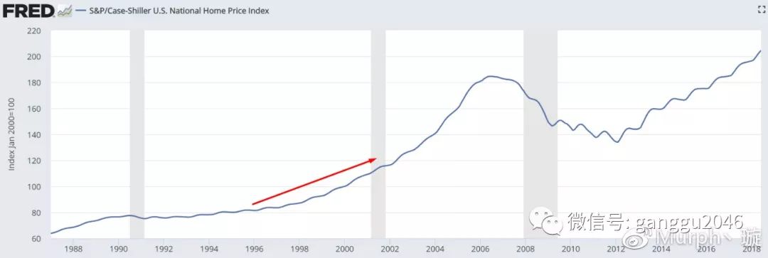如图为美国房价走势图,我们可以发现从1996到2001年之间,美国的房价就已经同债务一起在快速的上升了。可以想象,如果在2001年美联储没有印钞(降低利率)去救市的话,美国在当时会遭遇一场更持久的衰退,但是大概也可以避免后来在2008年遭遇次贷危机这样的灾难了(因为泡沫变得更大,债务变得更多)。